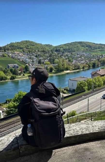 また、川沿いに建てられた街の風景を眺めるキャップ姿のつるのさんを後ろからパシャリ!