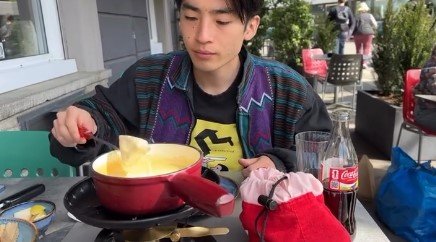 心地よい空気が流れるテラスで2人はチーズフォンデュを堪能します。つるのさんによると、山岳地方で暮らす牛たちのミルクを使っているそうで、一口食べてみると「味濃厚!」と舌鼓。とろっと溶けるチーズに思わずよだれがたれてしまいそう。