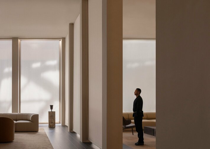 コペンハーゲンを代表するデザイン集団 ノームアーキテクツの共同創設者 ヨナス・ビエレ=ポウルセンが、アートディレクターのクリスチャン・モラー・アンデルセンと協働してデザインしたこの460平方メートル の空間は、イタリアの歴史主義建築と1930年代モダニズムの幾何学的な秩序から着想を得ています。高くそびえる列柱がゲストをいくつもの空間へと導き、リズム、プロポーション、素材の調和によって、静けさの中に温かみのあるオドーならではの雰囲気が生み出されています。
