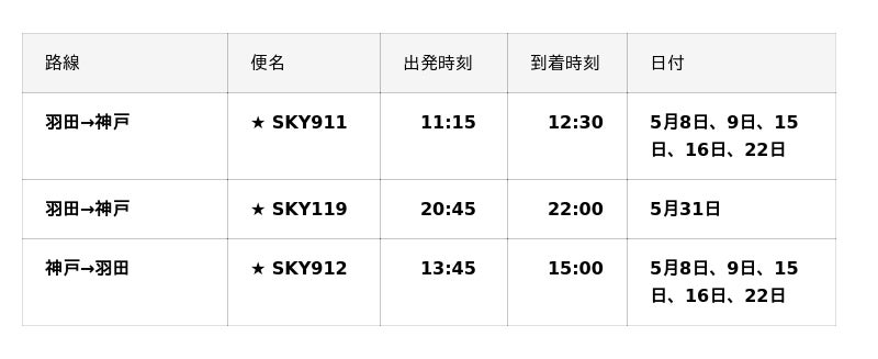 ■2026年5月/6月『羽田=神戸』線、『神戸=羽田』線臨時便一覧