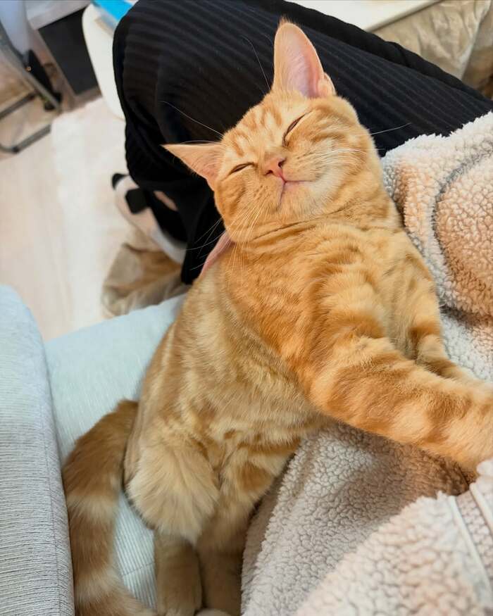 普段の様子では、飼い主さんの膝の上に乗っかり、目を細めて気持ちよさそうに眠る姿が。