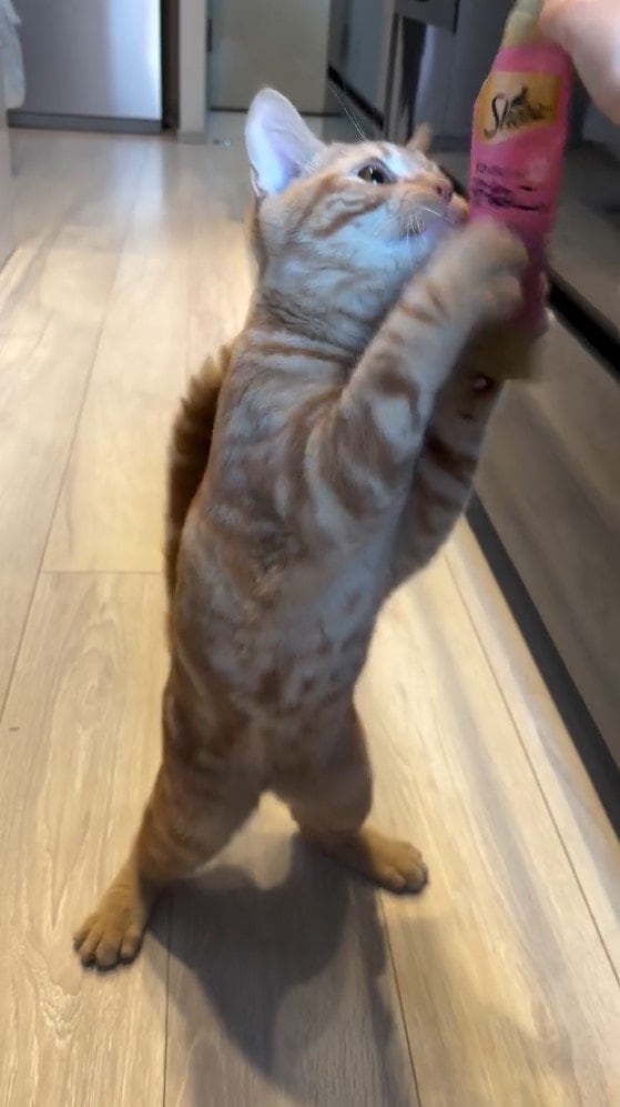 食いしん坊のあまり、二足立ちになっておやつにしがみついたりと、やんちゃな子猫らしい一面がたくさんあります。