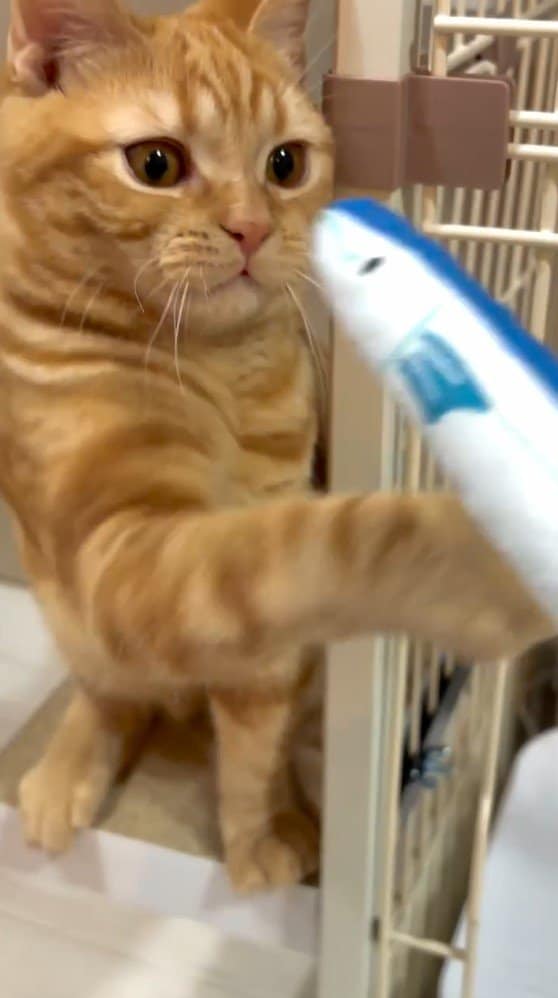 また、魚のおもちゃに向かって前足でぺしぺししながら“プチバトル”を繰り広げたり…。