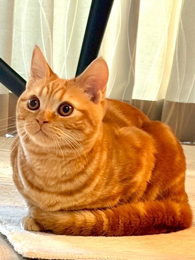 前足と後ろ足をキレイに折りたたんで座り、くりくりとした瞳で見上げているのは、現在生後8ヵ月のスコティッシュストレート「めろん」くん。