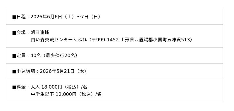 一般社団法人やまがたアルカディア観光局(山形県)は、2026年6月6日(土)~7日(日)の2日間、「第29回 朝日連峰山開き登山」を開催します。