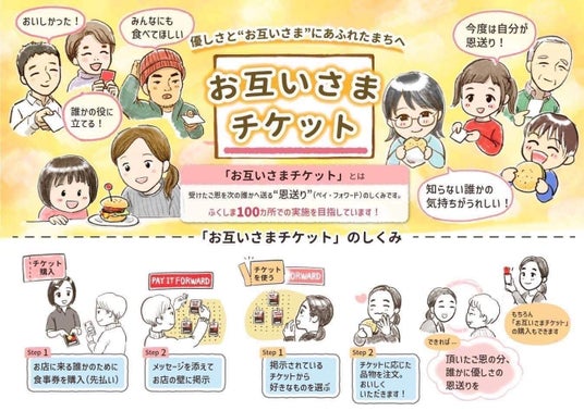 NPO法人チームふくしまが推進する「お互いさまチケット」は、店舗を利用するお客さんが見知らぬ誰かのためにチケットを購入することで、チケットを利用する方が無料で食事やサービスを受けられる仕組みです。「困ったときはお互いさま」の気持ちで溢れる街の実現を目指し、福島市内100店舗への導入を目標としています。