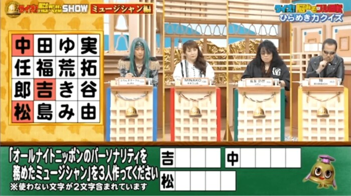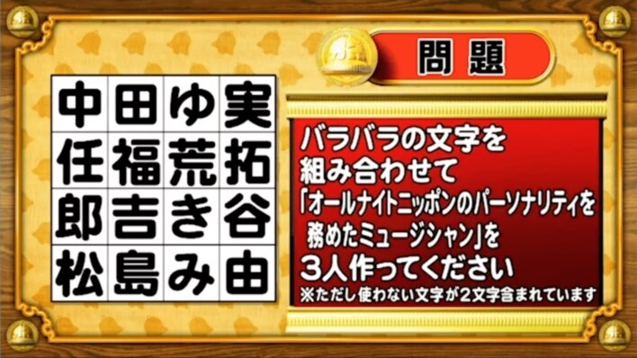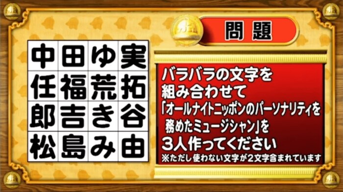 最初は、ラジオDJパズル。バラバラの文字を組み合わせて、人気ラジオ番組「オールナイトニッポン」のパーソナリティを務めたミュージシャンの名前を3人作ってください。