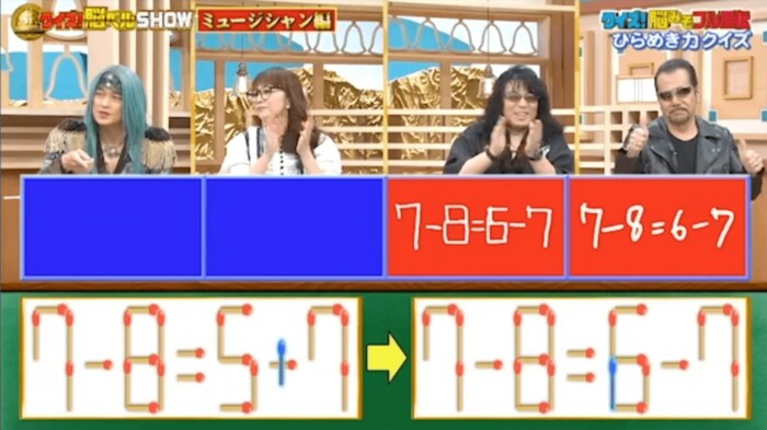 正解はまず、右の式の「+」から1本を動かし「-」にします。その1本を同じ式の「5」に足して「6」にします。そうすれば「7-8=6-7」となります。長友さんと翔さんが正解。