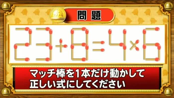 次は、マッチ棒問題。次の式のマッチ棒を1本だけ動かして正しい式にしてください。