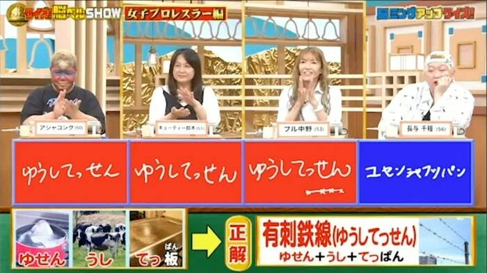 正解は、「有刺鉄線(ゆせん+うし+てっ)」。アジャさん、キューティーさん、ブルさんの3人が正解です。