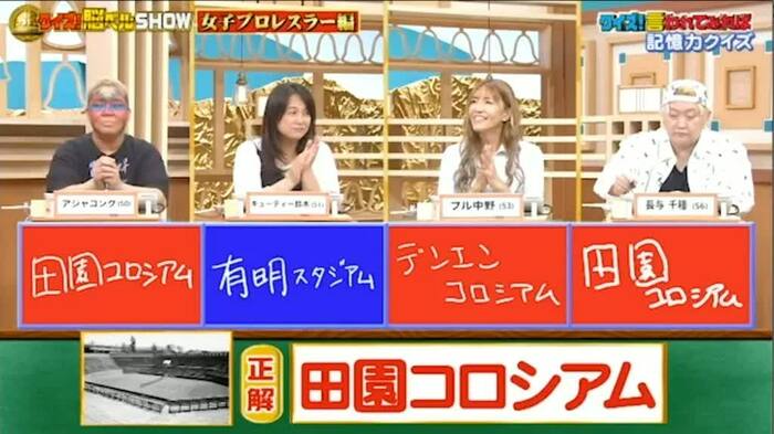 正解は、「田園コロシアム」。アジャさん、ブルさん、長与さんが正解です。
