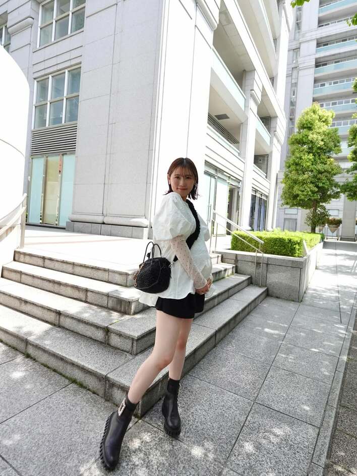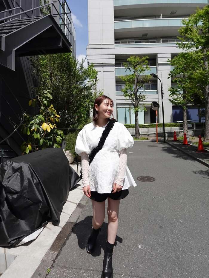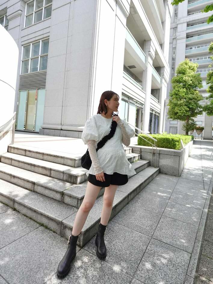 西野さんは、白いボリューム袖のトップスに黒のショートパンツを合わせたモノトーンコーデを披露。黒いブーツと斜め掛けのショルダーバッグが、全体のバランスを引き締めています。