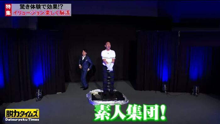 DAIKIさんのスゴ技で、両手を箱の上部に残したまま、頭だけが下に伸びていくイリュージョンを成功させましたが、マイクトラブルでまたも一人とり残されることに…。