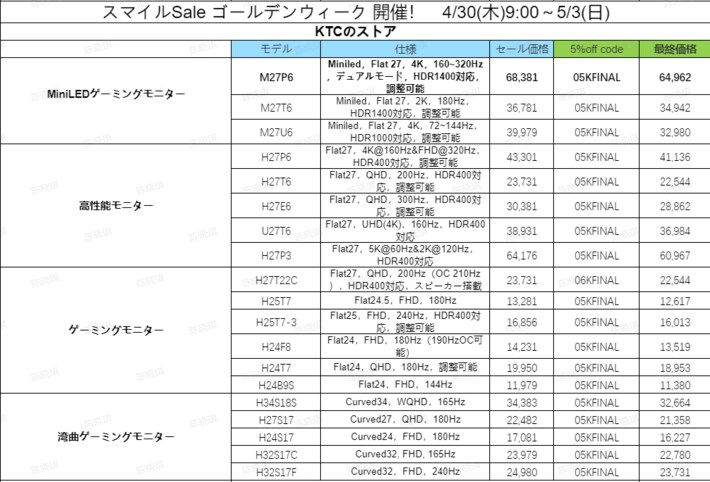 中でも注目は H27T27S(27インチ・WQHD・144Hz)。