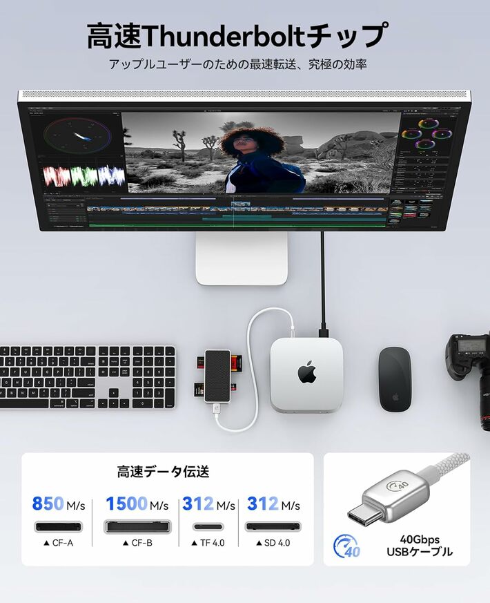 Type Bは最大1500MB/s、Type Aは850MB/s、SDカードは312MB/sの高速転送に対応。Thunderboltチップ技術を採用し、MacやiPad Proなど40Gbps USB-C搭載デバイスとの高い互換性を実現します。
