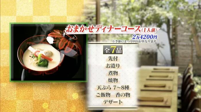 「おまかせディナーコース」(1人前/2万4200円)では、全7品が味わえます。(※季節によって内容が異なります)