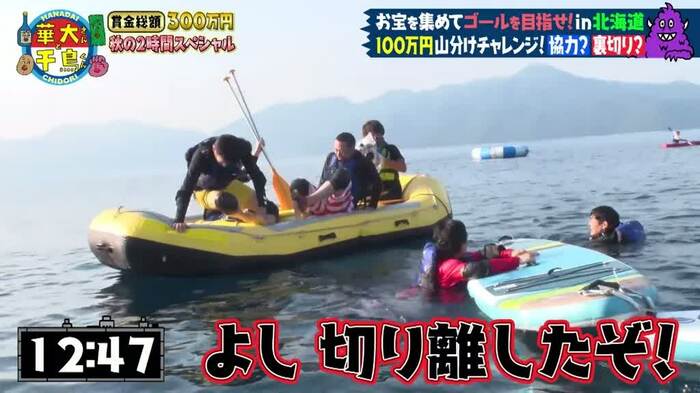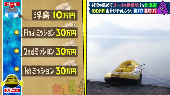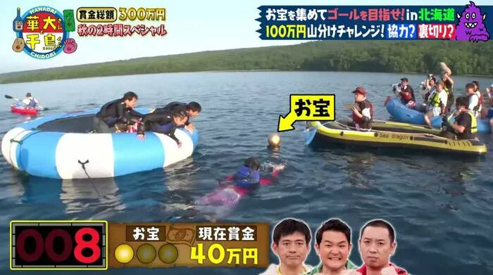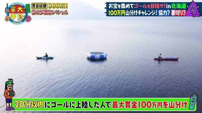 このチャレンジは、船でゴールの浮島を目指し、制限時間内にたどり着けたら、ゴールに上陸した人だけで最大賞金100万円を山分けできるというもの。