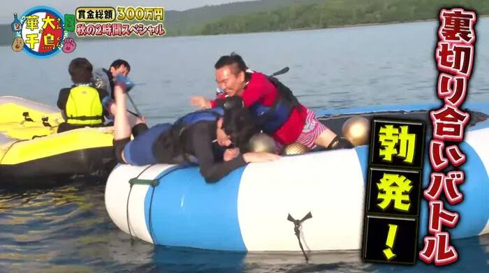 山内さんは、浮島に乗ろうとする華丸さんや大吉さんを次々と突き落としました。