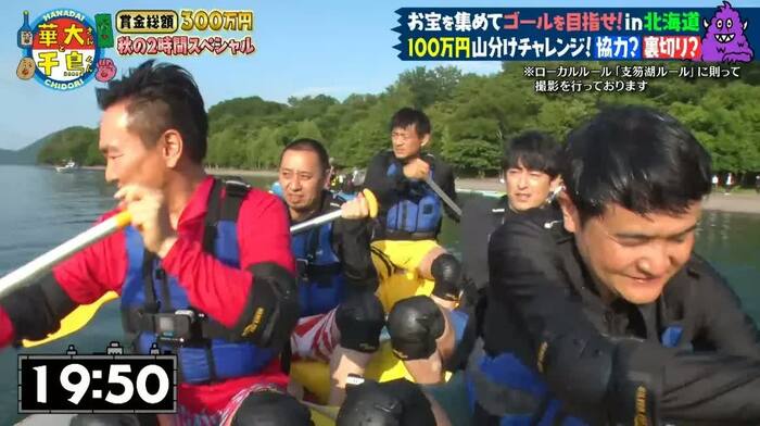 北海道の支笏湖を舞台に、博多華丸さん、博多大吉さん、千鳥(大悟さん、ノブさん)、山内健司(かまいたち)さんの5人が参加。進行は、津田篤宏(ダイアン)さんが務めました。