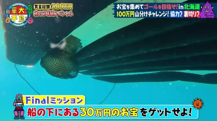 Finalミッションは、一同が乗る船の下にくくりつけられた30万円のお宝をゲットすること。ここは、島育ちの大悟さんが素潜りで挑み、なんとか成功させました。