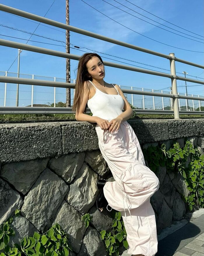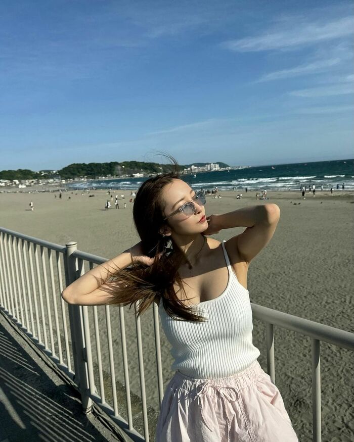 板野さんは「なんまいめ?ナツノオワリ、海もまた来年」とコメントし、素肌がまぶしい白いキャミソールに薄いピンクのカーゴパンツをあわせたコーデを披露しました。