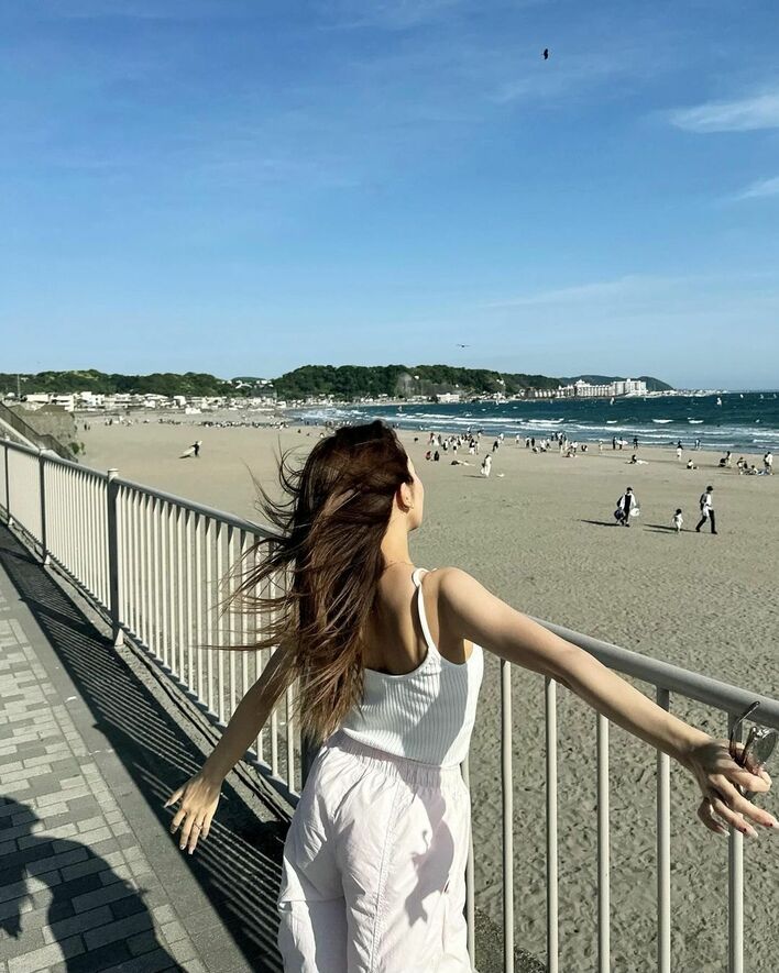 海辺で風に髪をなびかせているショットや…