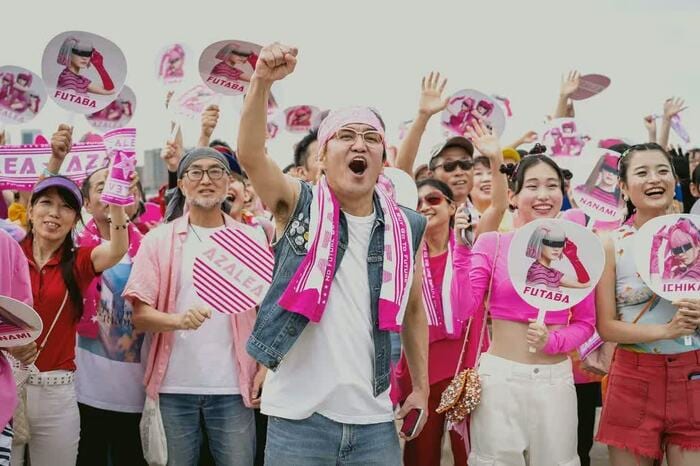 ファン役のエキストラもノリノリで体を揺らしており、まるで本物のライブ会場のよう。ちなみに、観客のなかには徳井健太(平成ノブシコブシ)さんの姿も!AZALEAファンを、先陣を切って引っ張る古参ファンの姿に注目です。