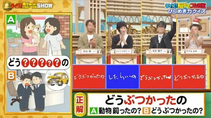 正解は「どうぶつかったの(動物 飼ったの?/どう ぶつかったの?)」。鳥谷さん、浅岡さん、金魚さんの3人が正解。