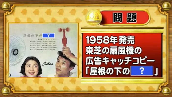 最後は、広告キャッチコピー問題。今から65年前の1958年、東芝の扇風機の広告キャッチコピー「屋根の下の[?]」。「?」に入る言葉をお答え下さい。