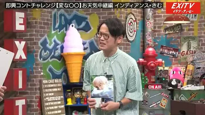 今回のシチュエーションは「お天気中継」。お天気お姉さん役をりんたろー。さんが務め、最後に田渕さんときむさんのどちらが面白かったかを兼近さんがジャッジする「先輩が汗かいて後輩が審査するシステム」だと説明されると、田渕さんときむさんは「おかしいやろ!」と言いながらも、挑戦スタート。