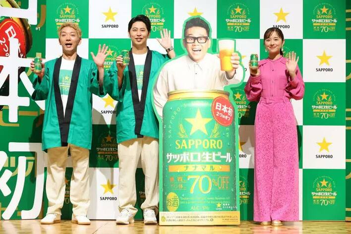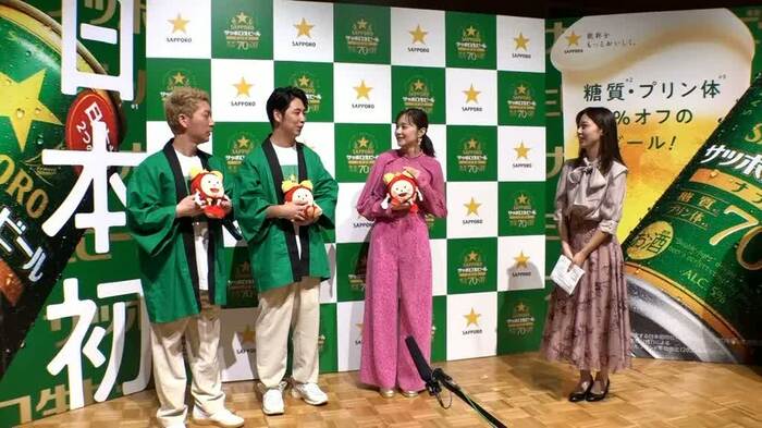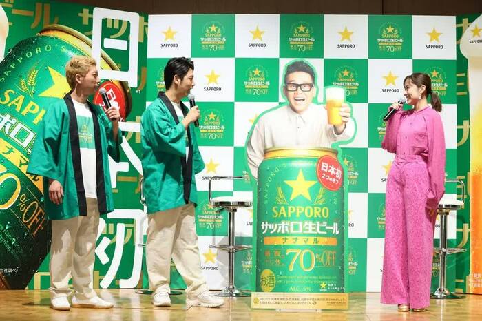 堀田真由さんとニューヨーク(嶋佐和也さん、屋敷裕政さん)が10月16日、「サッポロ生ビール ナナマル」新CM発表会に登壇しました。