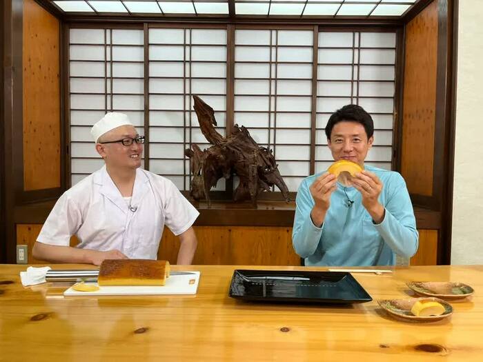 松岡さんが、「20個くらい使っていると思います」と答えると、正解は約21個ということでほぼ正解。巨大な伊達巻を分厚くカットしてもらい、漂う甘い香りに「いやいやいや、すっごい甘い香り」と驚き、さらに手で持つとプルンプルンに揺れる伊達巻に驚嘆の声をあげます。