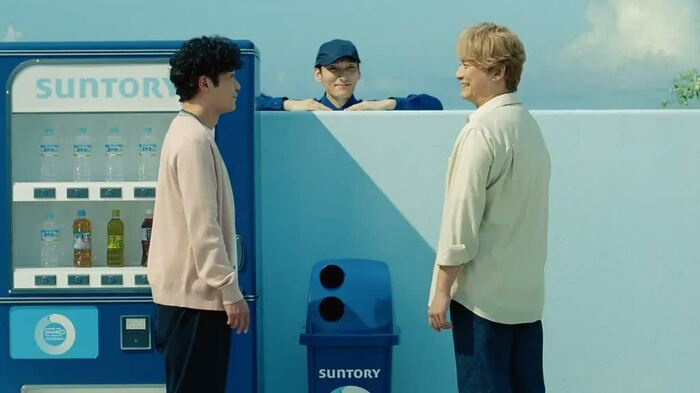 CMは、自動販売機とリサイクルボックスの前で、ペットボトルを手にした稲垣さんと香取さんのかけ合いを長回しで撮影。そんな2人のやりとりを見聞きできる場所に草彅さんはスタンバイし、自然な会話劇を収録したそうです。