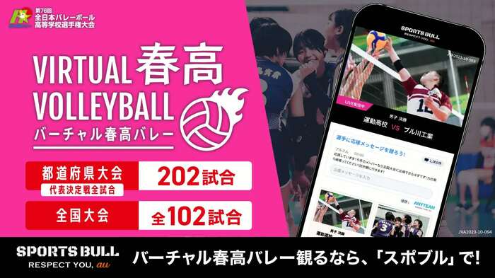 フジテレビと、運動通信社およびKDDIは、運動通信社とKDDIが共同で運営するスポーツメディア「SPORTS BULL(スポーツブル)」内「バーチャル春高バレー」にて、2023年10月22日(日)から全国で行われる都道府県大会の代表決定戦を含む計202試合と、2024年1月4日(木)から開催される「第76回全日本バレーボール高等学校選手権大会(以下 春高バレー)」全102試合の、過去最多となる合計304試合を独占ライブ配信します。