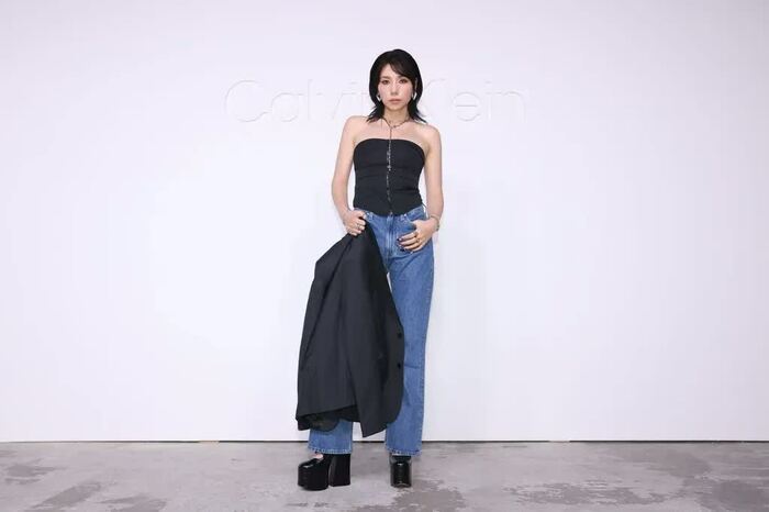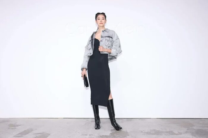 胸元があいたドレスに、ショート丈のデニムを合わせた森星さんは「『Calvin Klein』は、カジュアルでクリーンで、こびを売らない女性像のイメージだったので、デニムジャケットにちょっと女性的なエッセンスを入れたスタイルにしてみました」とコメントしました。