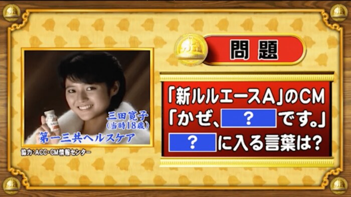 次は、名作CM問題。今から39年前の1984年、三田寛子さん(当時18歳)が出演していた、かぜ薬のCM。「かぜ、[?]です。」、「?」に入る言葉は何でしょうか。