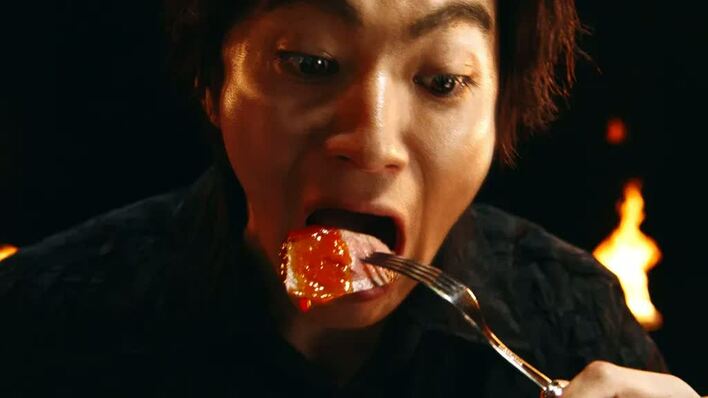 ソースを口の周りの絶妙な場所につけ、それを拭って見せるといった動きでも美味しさを表現していました。