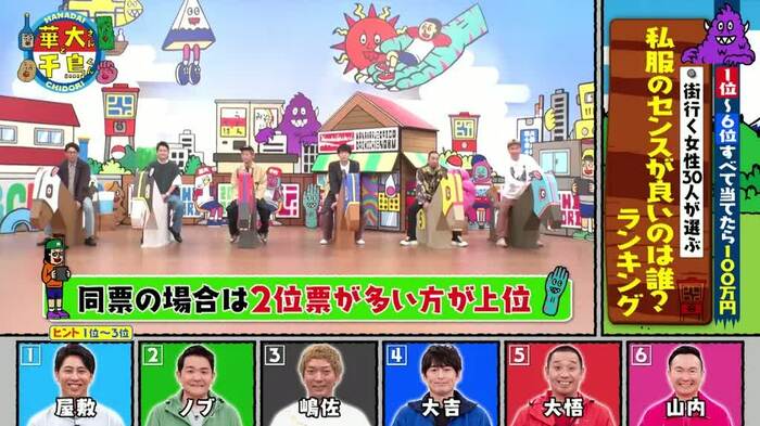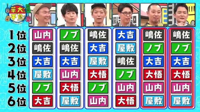 博多華丸さん、博多大吉さん、千鳥(大悟さん、ノブさん)、山内健司(かまいたち)さんを含めた7人のうち6人がランキングに参加し、3つのお題に対して全員で順位を予想しました。