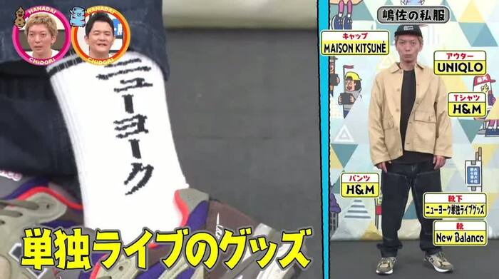H&MのTシャツとパンツに、ユニクロのアウターを合わせたカジュアルな装いで、足元には、縦書きで「ニューヨーク」と書かれた単独ライブのグッズ靴下がチラ見え。