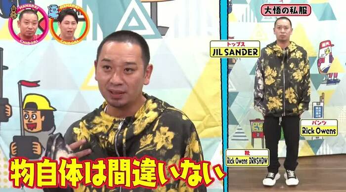 黒いパンツに、大きな黄色い花柄のJIL SANDERのトップスが印象的で「攻めてるな!」(嶋佐)と声があがるなか、大悟さんは「これくらい攻めないとね」と意気込みました。