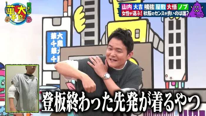 前回最下位のノブさんは、ニットを取り入れた装いで勝負に出るも、インナーが半袖だったため「半袖着てるやないですか!」(屋敷)、「秋や言うてんねん!」(大悟)とツッコミが。