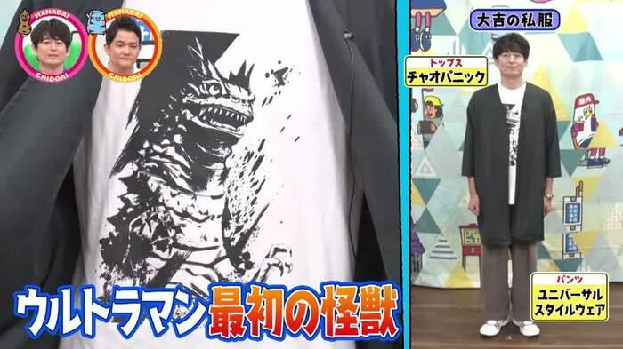 「ウルトラマン」の怪獣”ベムラー”がプリントされた白いTシャツに、妻が選んだという長めの上着を羽織ったシンプルなスタイル。