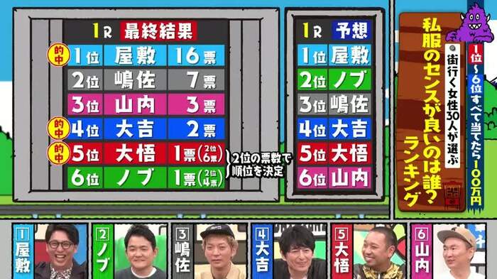 屋敷さんは「大悟さんより、山内さんのほうが下な気がしてきました。誰も1位に入れない格好してるんで」ということで、大悟さんを5位、山内さんを最下位に予想。