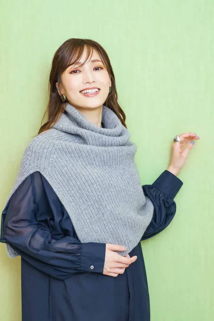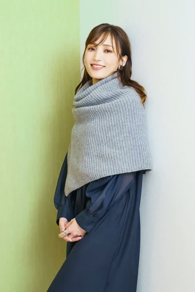 衣装:スヌード風ケープ¥24,200、シャツワンピース¥46,200(ともにモガ)/イヤリング¥2,100、リング¥12,600(ともにアビステ)/ブーツ(スタイリスト私物)