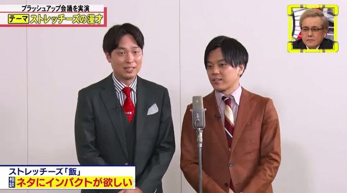 会議には、ネタ見せ&相談者として「ツギクル芸人グランプリ2022」優勝で注目のストレッチーズ(福島敏貴さん、高木貫太さん)と、芸歴14年の実力派コント師・わらふぢなるお(口笛なるおさん、ふぢわらさん)が登場。