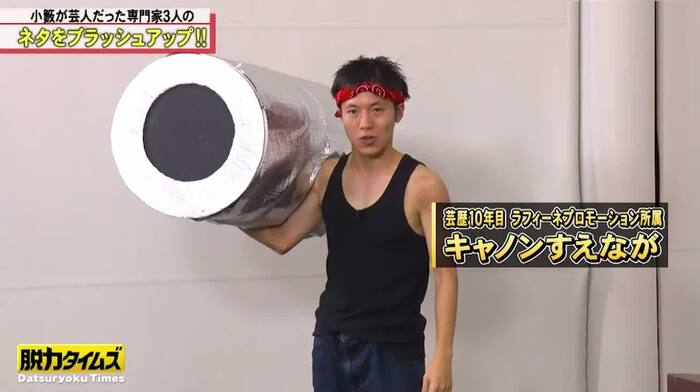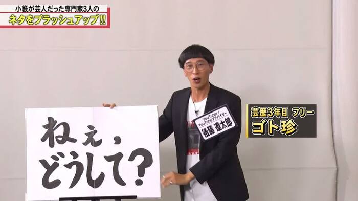 そして、佐久間アナから3人の本業が芸人で、それぞれ、バルバル三浦、キャノンすえなが、ゴト珍という名前で活動していることが明かされると、キャスターアリタの提案で「小籔さんを見返すために、ネタをやってみたら?」ということに。