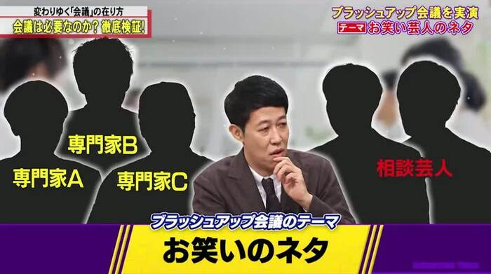 そこで、「会議は本当に必要なのか?」を実証するため、お笑いのネタについてのブラッシュアップ会議を実演。小籔さんに参加してもらい、その必要性を検証しました。