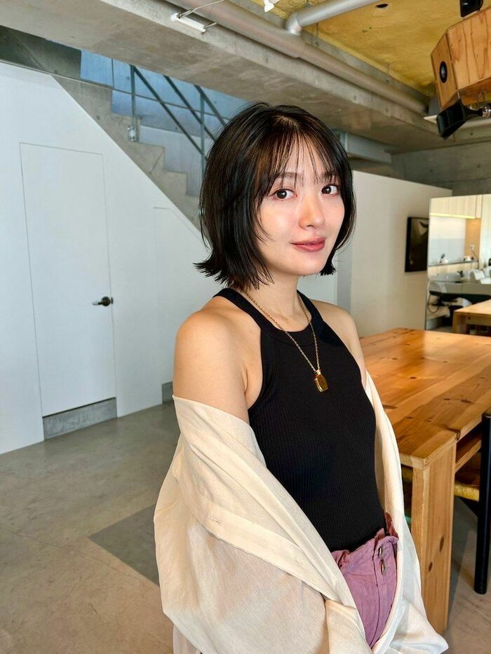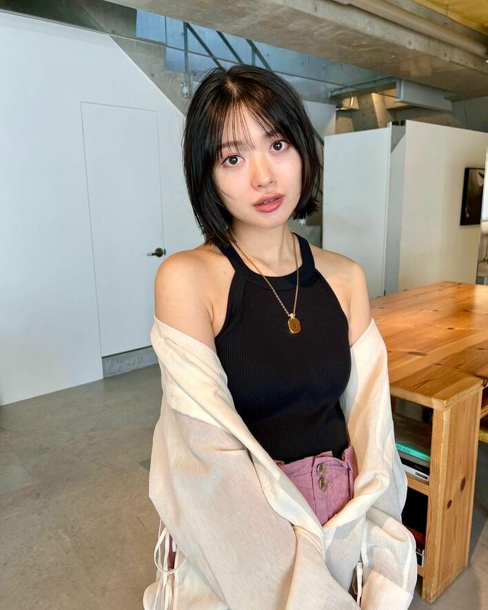 公開されたショットを見ると、黒のホルダータンクトップを着て、羽織った白の上着を肩から落とし、紫色のズボンをはいたカジュアルスタイルに。カメラに向かって大人っぽい表情を浮かべています。