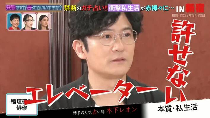 さらに、レオンさんが「非常にせっかち。エレベーターに乗ったら、すぐに『閉』ボタンを押す」と占うと、稲垣さんは「エレベーター、許せない」と反応。エレベーターの待ち時間も「耐えられない」と感じるのだとか。