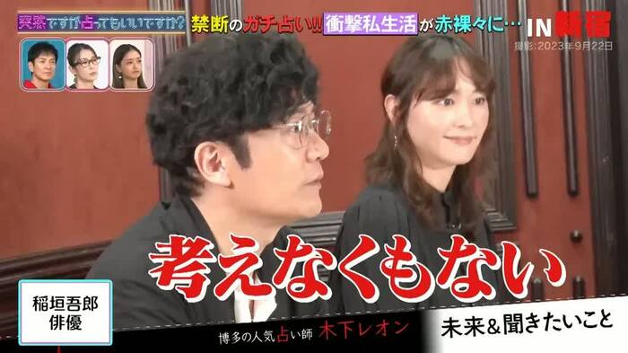 するとレオンさんは「(結婚は)してもしなくても後悔する」と断言し、稲垣さんは戸惑いの表情に。占いによると、これから10年間は運気が最高潮に良く、誰かと二人三脚で生きることを煩わしく感じてしまう可能性があるのだとか。